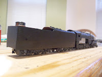 The locomotive is built from a trio of Bachmann Northern shells cut and spliced back together. The cab is a combination of the cabs from the same models, although the cab sides are made from styrene. The cast pilot is Bachmann pilot covered in Squadron Green putty sanded to shape. Some of the details, like the tanks under the running boards were cut from scrap. The long distance tender is a combination of USRA and Pennsy tenders with a few pieces of styrene. Currently the trucks don't swivel, there isn't any room between the skirts. I'm not sure how I'm going to solve that yet.