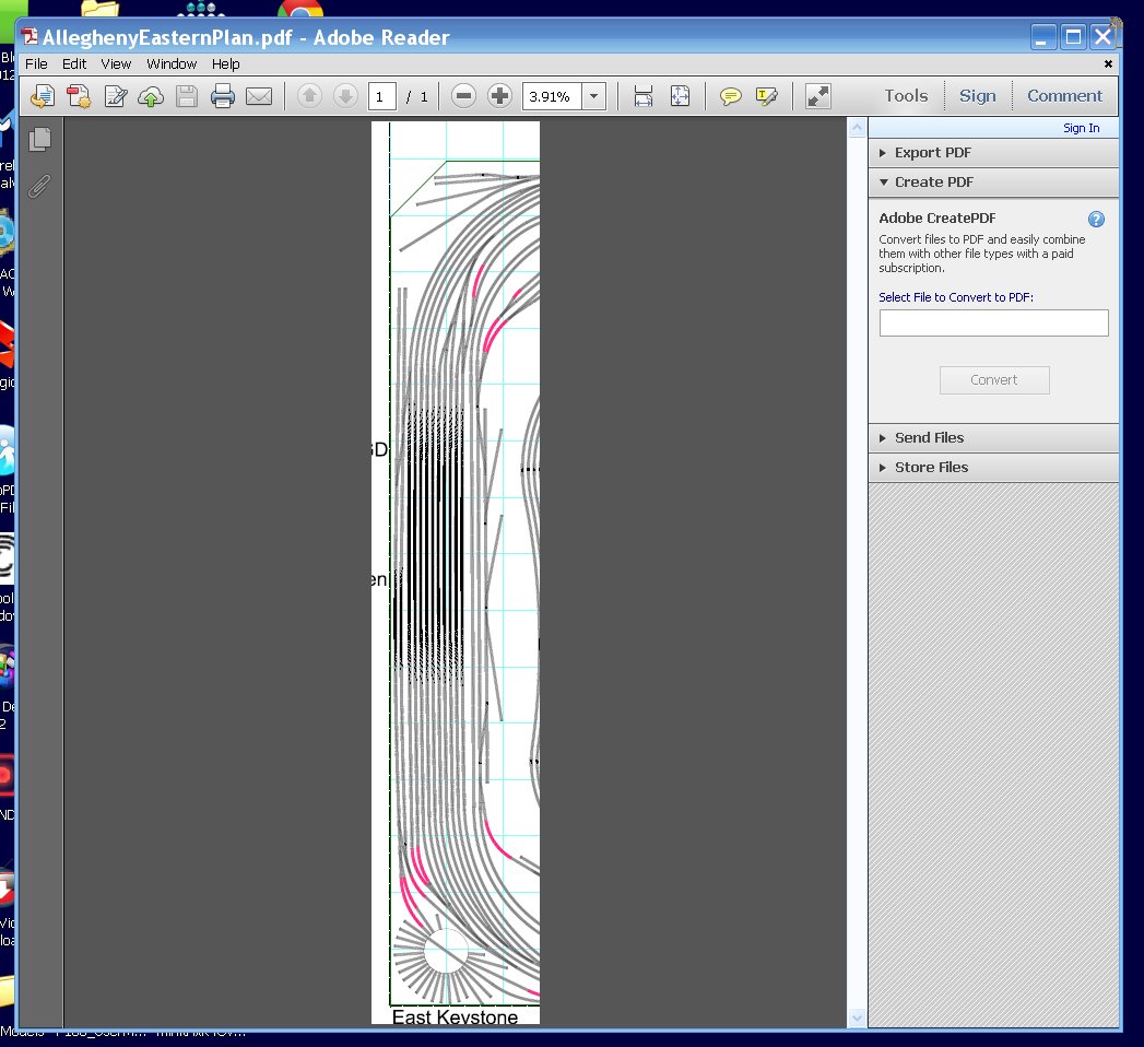 You get the idea. I wasted a TON of time. I eventually discovered after fooling around long enough that I could make the necessary file directly from the model railroad design software. What I really needed was a software that produces PDF files and pretends it's a printer. The software I used is called PrimoPDF. I was able to download a trial version and check it out. I installed it and Voila! I now have PrimoPDF as a printer selection. When I print out the track plan I select this as my printer and click print. The software asked me what to name the file. It then opens a PDF viewer so I can see what...What...No, that's not right. Arrrgh!