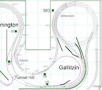 The end result was that Tracks 3 and 4 now run parallel to each other from SF through the tunnels and into Gallitzin. Once I get the clamps off at McGinleys Tracks 3 and 4 will come into Bennington together and start to draw apart at BF...