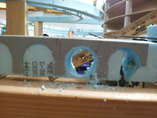 The tacky glue must actually work. This stuff is stuck fast and has to be scaped off. Now need to patch the place that I cut incorrectly.. I lay a length of foam above the gap and measure off where I need to cut it...