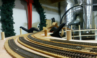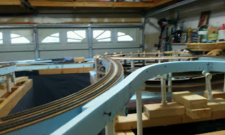 Almost made it. Got to within one section of flex track from the helix. Found enough rail joiners this time around but ran out of code 55. I have track left, but not full length sections. I'd rather go buy some more of those at the LHS. I've got some glue drying at the helix/approach joint si I would have to wait anyway. "Golden Spike" will be driven in the next few days. Then all the fun begins. Have to wire in the DCC power supplies and controllers. This includes the handheld throttles and the "LocoNet" installation. I'll need to add DCC to a few more locomotives. So far only three have decoders.